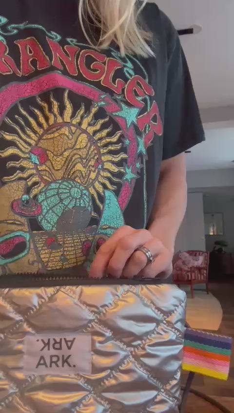 The Mobo bag is our "small" large bag that has room for almost everything you need on the road. Mobo Bag silver/leo with leo print inside and back and with a shiny silver front will be your best friend on your adventures.